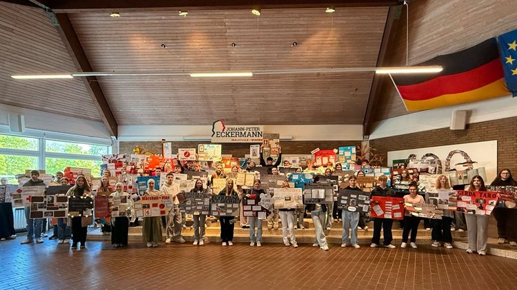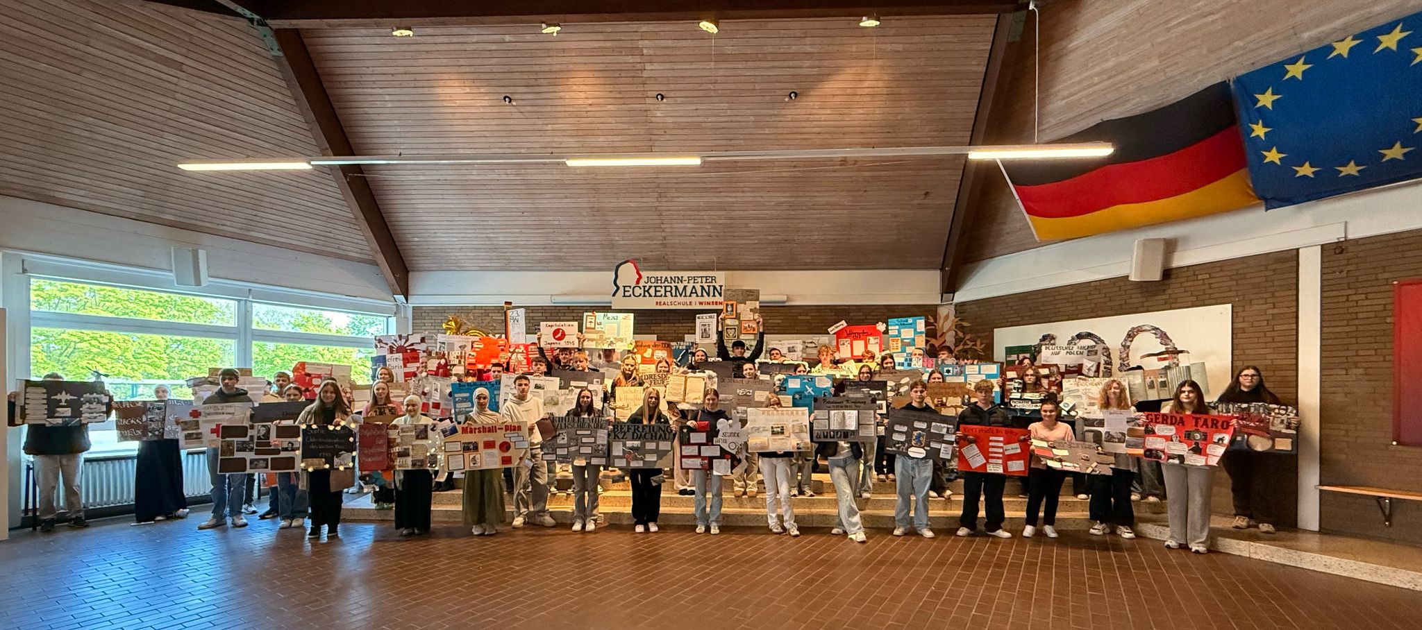 Aus Anlass des 80. Jahrestages dieses bedeutenden historischen Wendepunktes gestalteten Schülerinnen und Schüler der Jahrgangsstufe 10 der Johann-Peter-Eckermann-Realschule in Winsen/Luhe eine Ausstellung mit dem Titel „80 Jahre Kriegsende. Niederlage. Befreiung. Neuanfang“, die sich dem Ende des Zweiten Weltkrieges aus unterschiedlichen Perspektiven nähert und dessen komplexe Nachwirkungen – von Zerstörung und Flucht bis hin zu Aufbruch und Neuanfang beleuchtet.