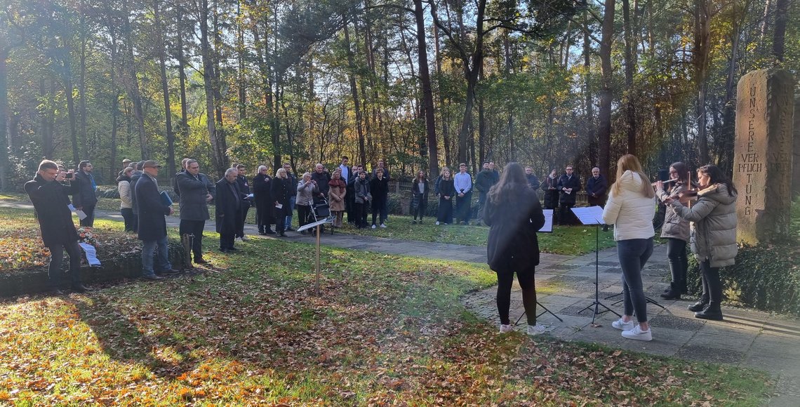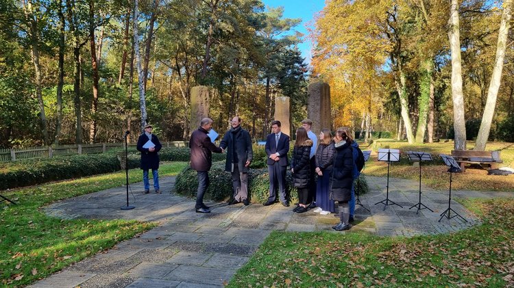 Bei sonnigen Herbstwetter und unter Teilnahme zahlreicher Gäste fand am 2. November 2021 eine lang geplante schulische Gedenkveranstaltung auf der Kriegsgräberstätte Sandbostel statt, bei der drei regionale Schulen für ihr langjähriges Engagement auf dem Lagerfriedhof mit einer Urkunde des Landesvorsitzenden des Volksbundes, Kultusminister Grant Hendrik Tonne, geehrt wurden.