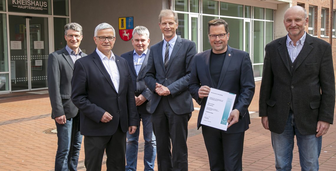 Amtsübergabe beim Kreisvorsitz des Volksbundes Deutsche Kriegsgräberfürsorge (von links): Jan Effinger (Bezirksgeschäftsführer Bezirksverband Lüneburg/Stade), Landrat a. D. Michael Roesberg, Kai-Ulrich Baak (Kreisgeschäftsführer), Harald Ottmar (Bezirksvorsitzender im Bezirksverband Lüneburg/Stade), Landrat und neuer Kreisvorsitzender des Volksbundes Kai Seefried sowie Karl-Friedrich Boese (Bildungsreferent im Bezirksverband Lüneburg/Stade). Foto: Landkreis Stade/Christian Schmidt